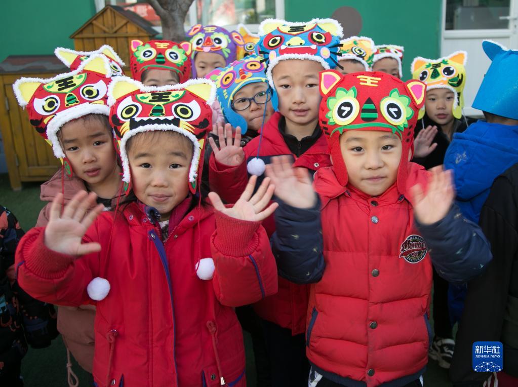 On December 29, children ofaffiliated kindergarten of Miaofengshan ethnic schoolin Mentougou District of Beijing take a group photo wearing tiger hats.