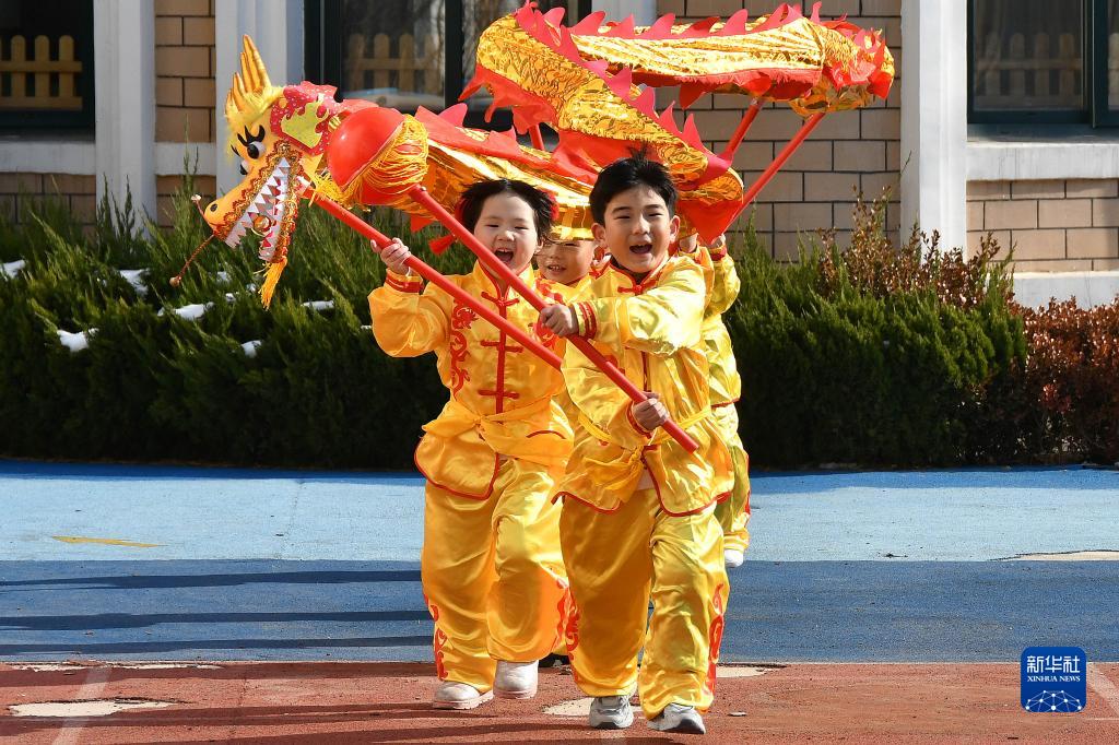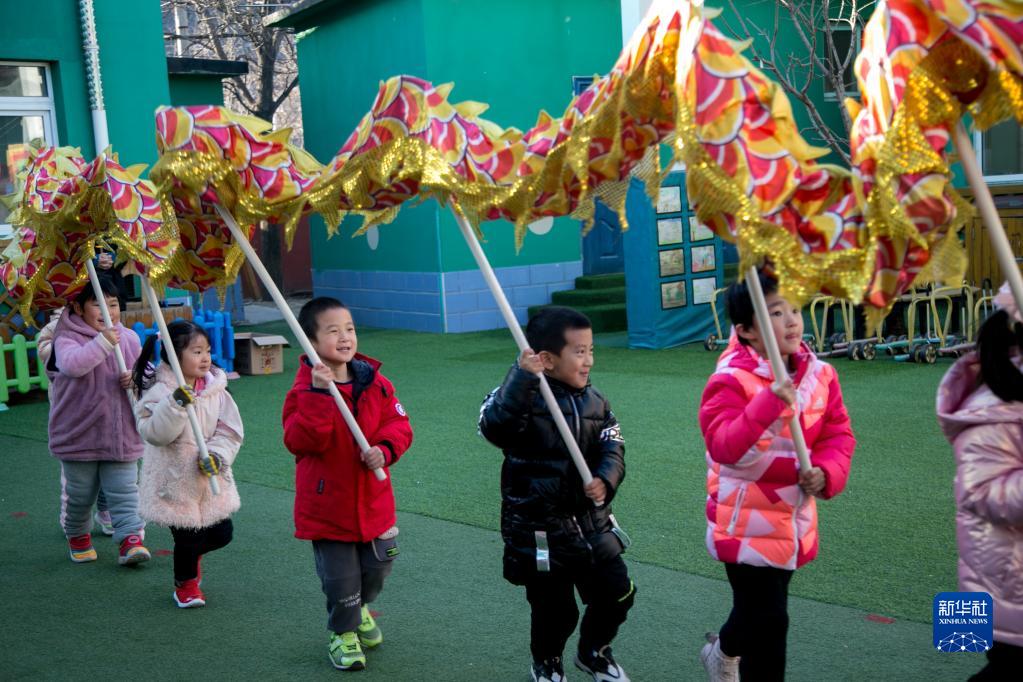 On December 29, children ofaffiliated kindergarten of Miaofengshan ethnic schoolin Mentougou District, Beijing give a dragon dance performence.