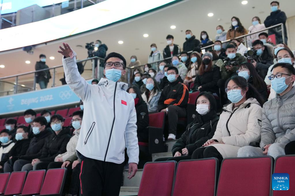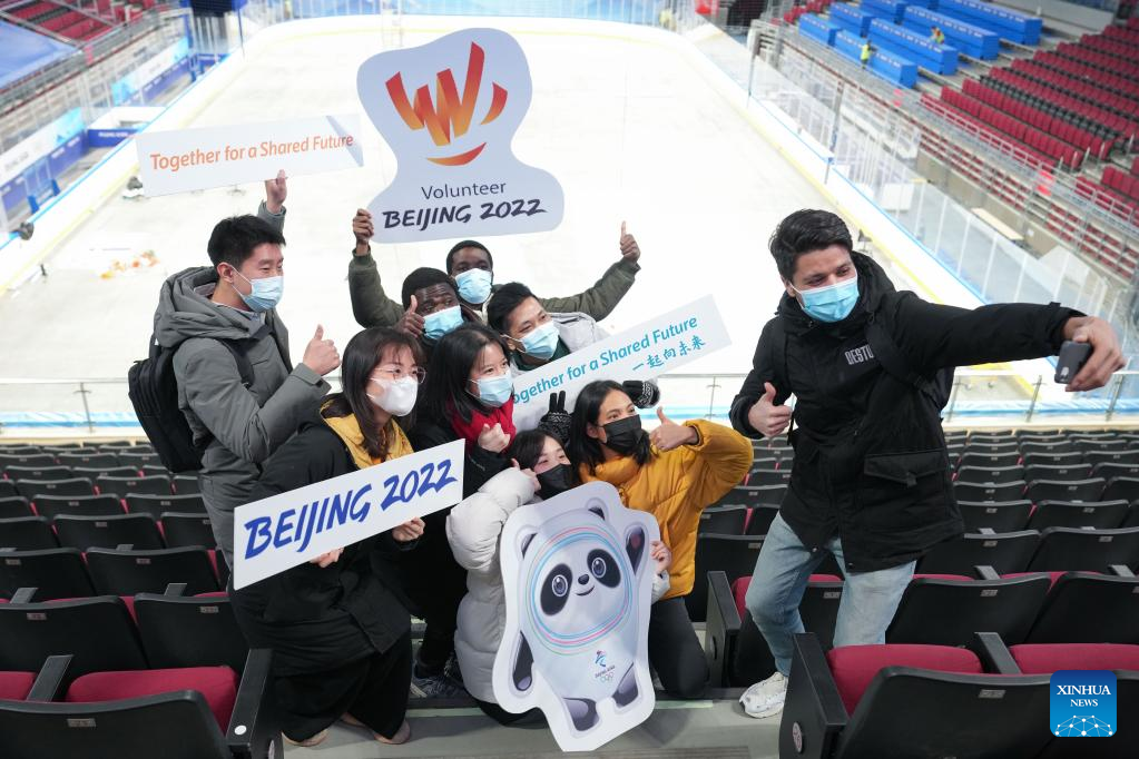 Volunteers from University of Science and Technology Beijing take group photos at Wukesong Sports Center in Beijing, capital of China, Dec. 30, 2021. The first batch of volunteers entered Wukesong Sports Center to participate in a training program ahead of Beijing 2022 Winter Olympic Games. The training program aims to help volunteers get familiar with all kinds of regularities of the venue operation team and the flows and positions of different areas in the venue. All 660 volunteers of Wukesong Sports Center divided in 6 batches will complete the training program before Jan. 15, 2022. (Xinhua/Ju Huanzong)