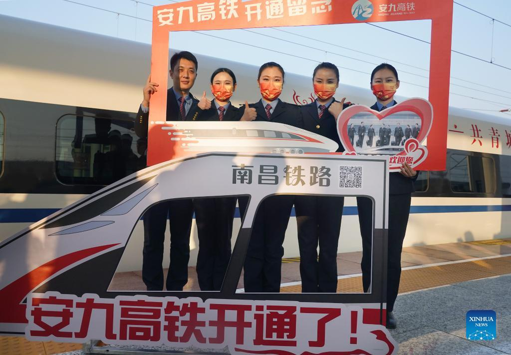 (211230) -- JIUJIANG, Dec. 30, 2021 (Xinhua) -- Crew members pose for photo at the platform of the Lushan Station along the Anqing-Jiujiang high-speed railway in east China's Jiangxi Province, Dec. 30, 2021. A new high-speed railway section linking Anqing City in east China's Anhui Province, with Jiujiang City in east China's Jiangxi Province began operation Thursday. The 176-km line, with seven stations along its route, will reduce travel time between Anhui's capital Hefei and Jiangxi's capital Nanchang to two hours and 22 minutes, according to China Railway Shanghai Group Co., Ltd. The Anqing-Jiujiang high-speed railway has a designed speed of 350 km per hour and is connected to China's vertical artery of the Beijing-Hong Kong Railway. (Xinhua/Wan Xiang)