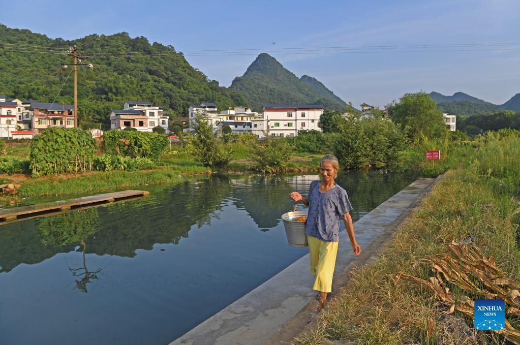An elder holding a bucket of clothes walks in Laoya Village of Zhangjia Township in Pingle County, south China's Guangxi Zhuang Autonomous Region, July 16, 2021. In 2021, Guangxi Zhuang Autonomous Region has made great efforts to accelerate improvement of rural living environment amid the bid to promote rural vitalization and upgrade the living conditions of rural residents. (Xinhua/Zhou Hua)