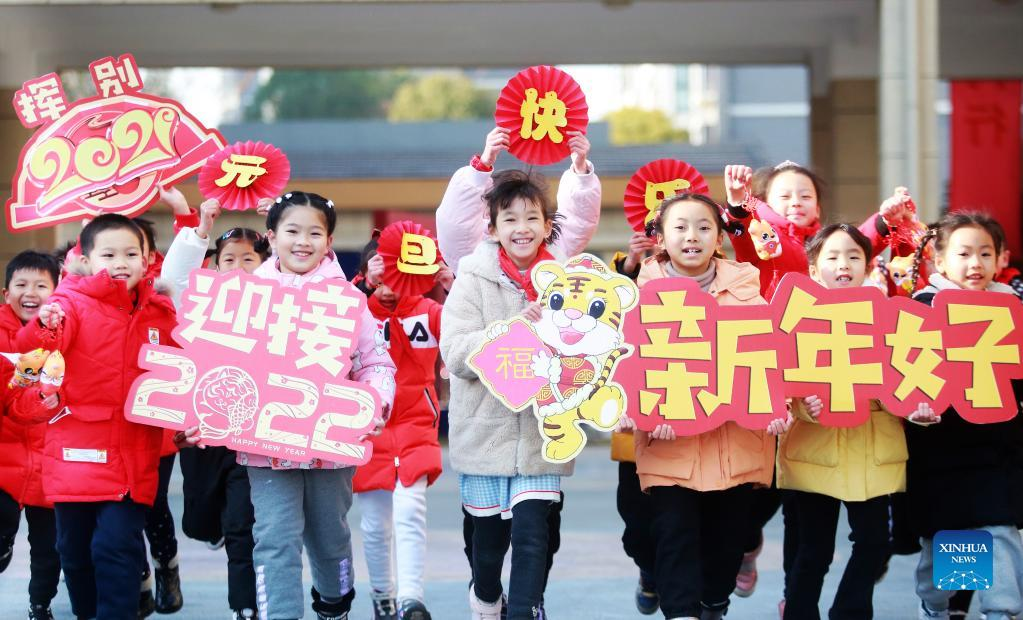 Pupils celebrate the upcoming New Year in Yangzhou, east China's Jiangsu Province, Dec. 30, 2021. Schools and kindergartens across China organize various kinds of activities as the New Year approaches. (Photo by Meng Delong/Xinhua)