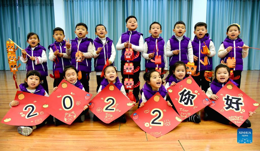 Pupils celebrate the upcoming New Year in Lianyungang, east China's Jiangsu Province, Dec. 30, 2021. Schools and kindergartens across China organize various kinds of activities as the New Year approaches. (Photo by Geng Yuhe/Xinhua)