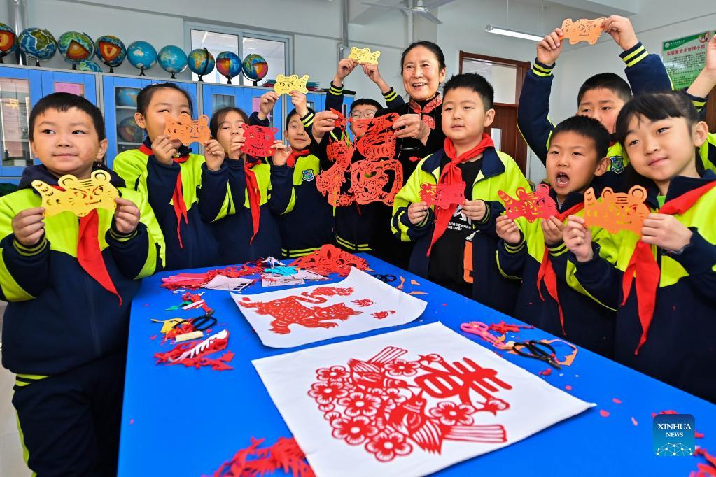 Pupils celebrate the upcoming New Year in Qingzhou, east China's Shandong Province, Dec. 30, 2021. Schools and kindergartens across China organize various kinds of activities as the New Year approaches. (Photo by Wang Jilin/Xinhua)