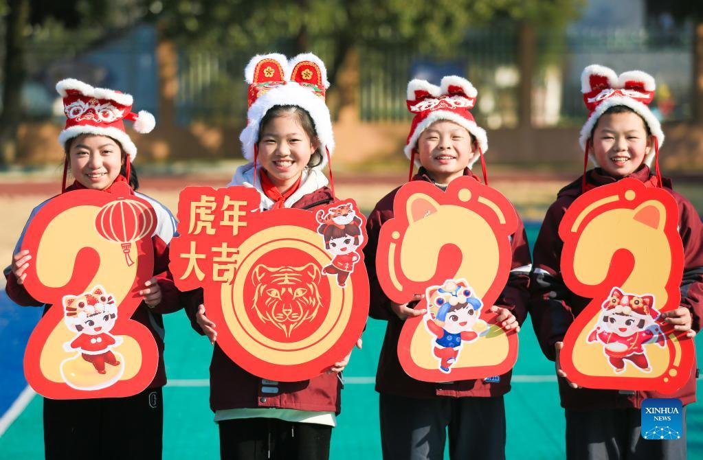 Pupils celebrate the upcoming New Year in Huzhou, east China's Zhejiang Province, Dec. 30, 2021. Schools and kindergartens across China organize various kinds of activities as the New Year approaches. (Photo by Wang Zheng/Xinhua)