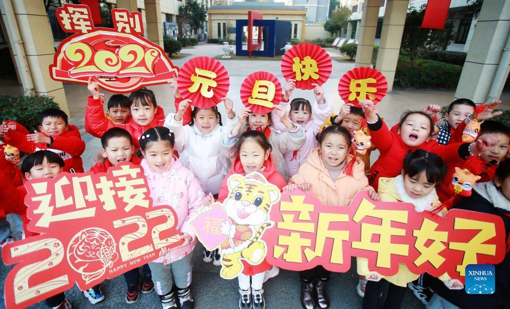 Pupils celebrate the upcoming New Year in Yangzhou, east China's Jiangsu Province, Dec. 30, 2021. Schools and kindergartens across China organize various kinds of activities as the New Year approaches. (Photo by Meng Delong/Xinhua)