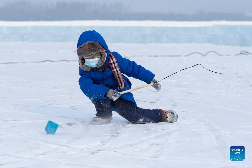 A kid has fun on frozen Songhua River at an ice-snow theme park in Harbin, northeast China's Heilongjiang Province, Dec. 30, 2021. (Xinhua/Xie Jianfei)