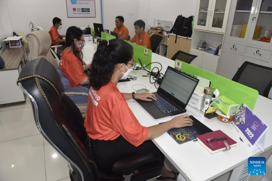 Employees work at online market Smile Shop in Phnom Penh, Cambodia, Dec. 21, 2021. The Regional Comprehensive Economic Partnership (RCEP), which is due to enter into force on Jan. 1, 2022, will promote cross-border e-commerce and narrow the development gap between developed and developing countries, said Jack Lee, chief executive officer and founder of online market Smile Shop in Cambodia.