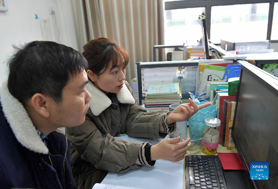 Fan Haiyan and her colleague discuss how to choreograph a dance at the special education school in Yichun City of east China's Jiangxi Province, Dec. 28, 2021. Fan Haiyan, a teacher of the special education school in Yichun City, learned sign language in her spare time to improve her teaching of students with hearing impairment. After years of practice, Fan could convey message quickly and correctly to her students when creating choreography or rehearsing dance routines. Fan and her students have participated in many art competitions these years, through which these children have found happiness and self-confidence. (Xinhua/Peng Zhaozhi)