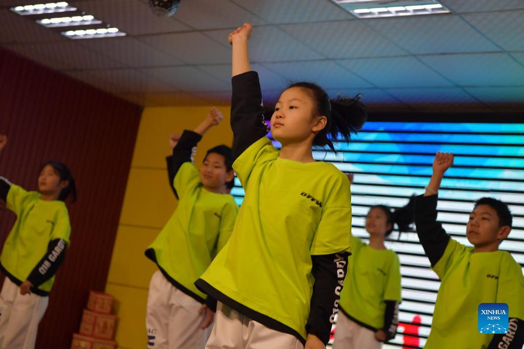 Pupils with hearing impairment practice dancing at the special education school in Yichun City of east China's Jiangxi Province, Dec. 28, 2021. Fan Haiyan, a teacher of the special education school in Yichun City, learned sign language in her spare time to improve her teaching of students with hearing impairment. After years of practice, Fan could convey message quickly and correctly to her students when creating choreography or rehearsing dance routines. Fan and her students have participated in many art competitions these years, through which these children have found happiness and self-confidence. (Xinhua/Peng Zhaozhi)