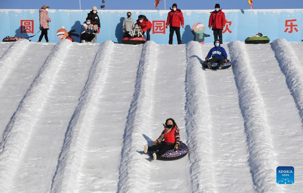 Visitors experience snow tubes at Yuanmingyuan Park in Beijing, capital of China, Dec. 30, 2021. The Old Summer Palace, or Yuanmingyuan, announced on Thursday that it will hold a ice and snow festival which opens around New Year's day in 2022 and lasts until February to welcome the Beijing 2022 Winter Olympic Games. (Xinhua/Luo Xiaoguang)