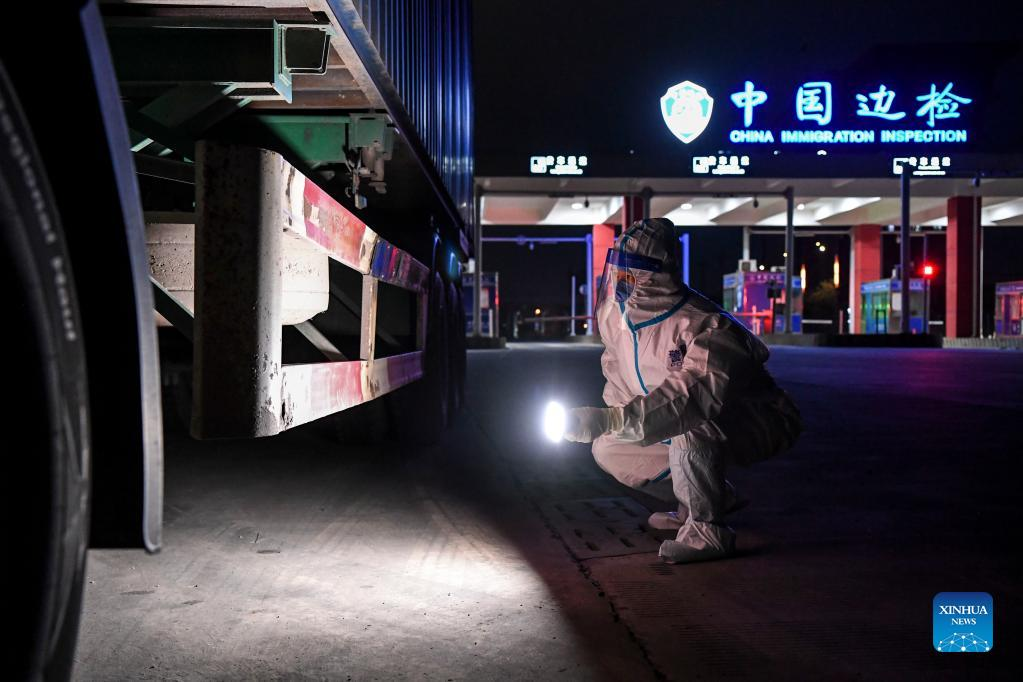 A police officer of immigration inspection checkpoint checks a truck at Dongxing port in Dongxing, southwest China's Guangxi Zhuang Autonomous Region, Dec. 30, 2021. Recently immigration inspection checkpoint in Dongxing has upgraded epidemic control and prevention measures by carrying out round-the-clock patrol. (Xinhua/Cao Yiming)