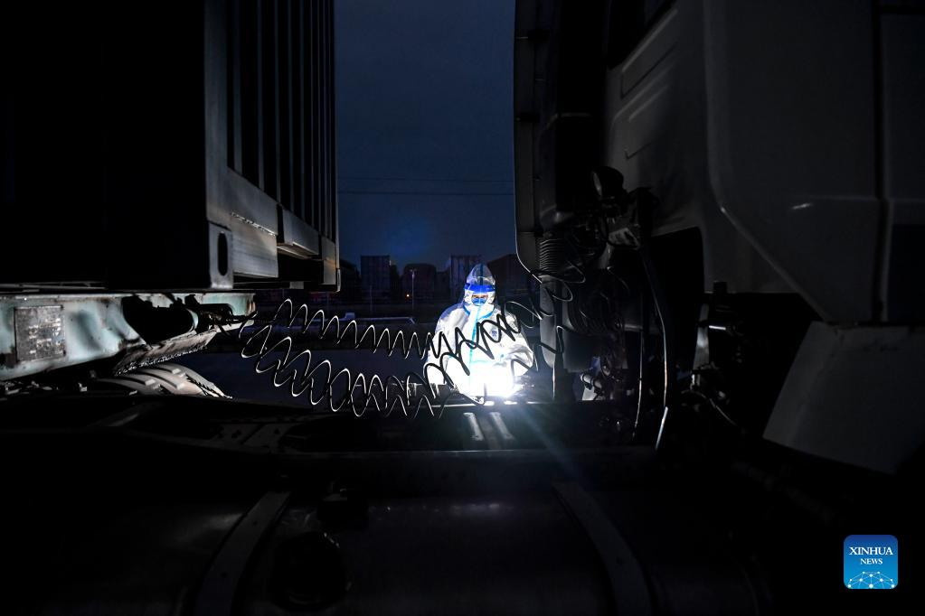 A police officer of immigration inspection checkpoint checks a truck at Dongxing port in Dongxing, southwest China's Guangxi Zhuang Autonomous Region, Dec. 30, 2021. Recently immigration inspection checkpoint in Dongxing has upgraded epidemic control and prevention measures by carrying out round-the-clock patrol. (Xinhua/Cao Yiming)
