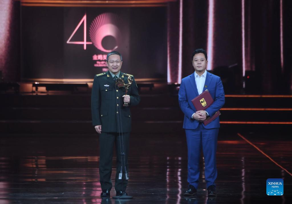 Representatives for the film "Island Keeper" receive the Best Feature Film Award at the awarding ceremony of the 34th China Film Golden Rooster Awards in Xiamen, southeast China's Fujian Province, Dec. 30, 2021. The awarding ceremony of the 34th China Film Golden Rooster Awards was held in Xiamen on Thursday. (Xinhua/Lin Shanchuan)