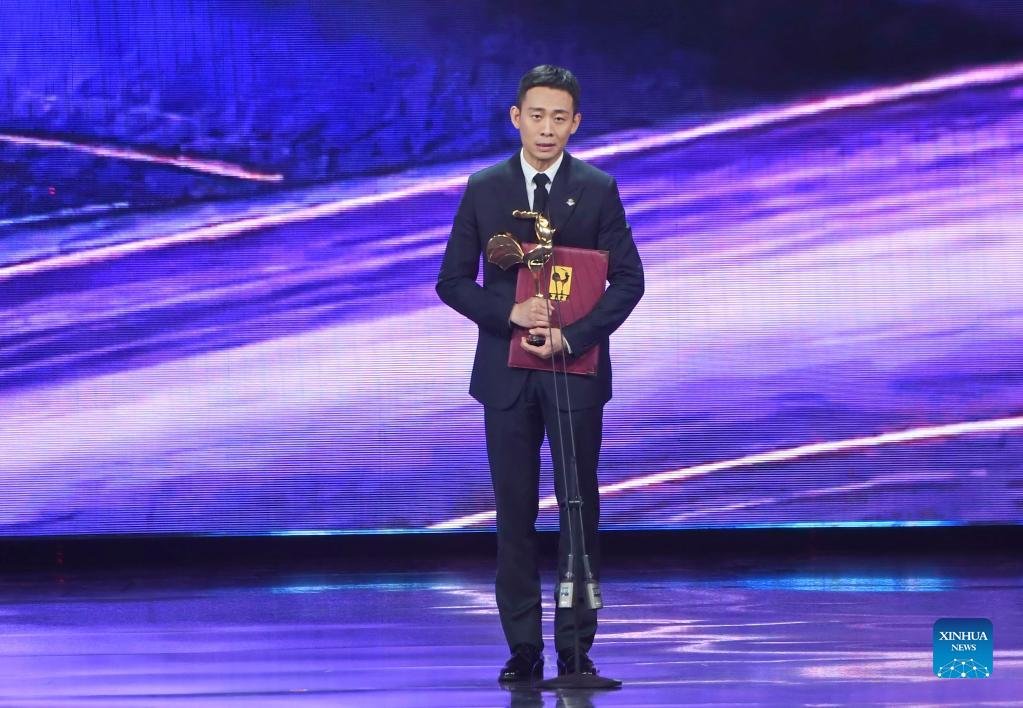 Zhang Yi wins the Best Actor Award for his role in the film "Cliff Walkers" at the awarding ceremony of the 34th China Film Golden Rooster Awards in Xiamen, southeast China's Fujian Province, Dec. 30, 2021. The awarding ceremony of the 34th China Film Golden Rooster Awards was held in Xiamen on Thursday. (Xinhua/Lin Shanchuan)