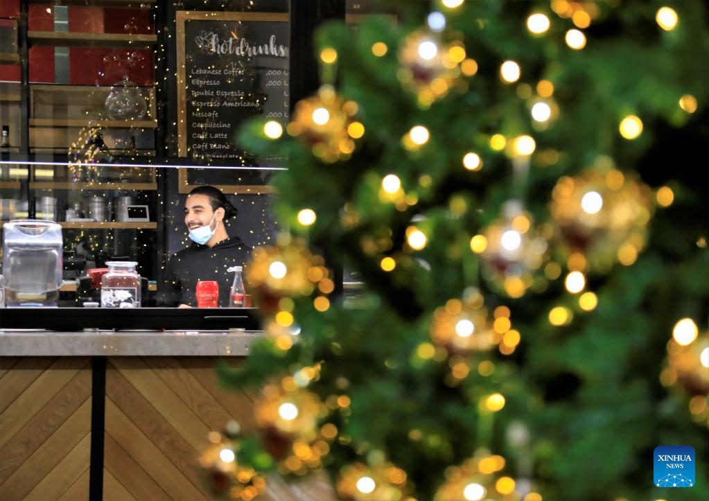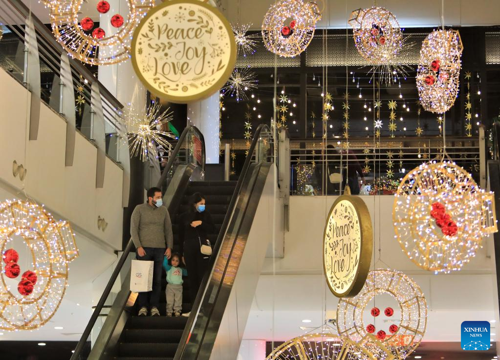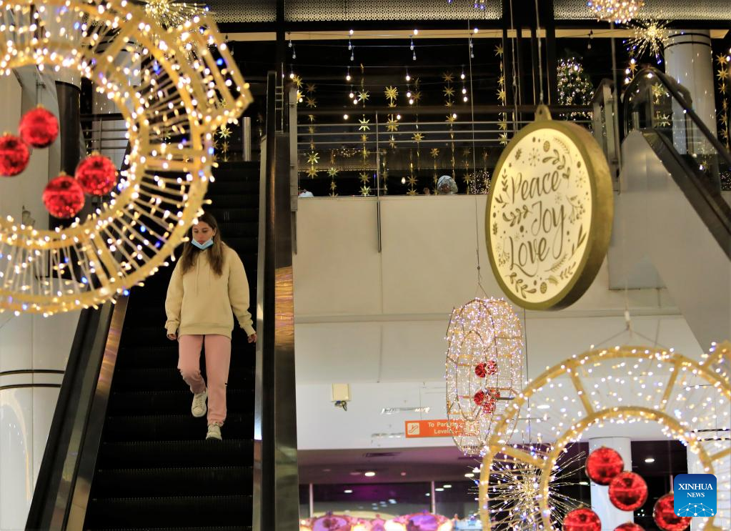 Holiday decorations are seen in a shopping mall on the outskirts of Beirut, Lebanon, Dec. 30, 2021. (Xinhua/Liu Zongya)