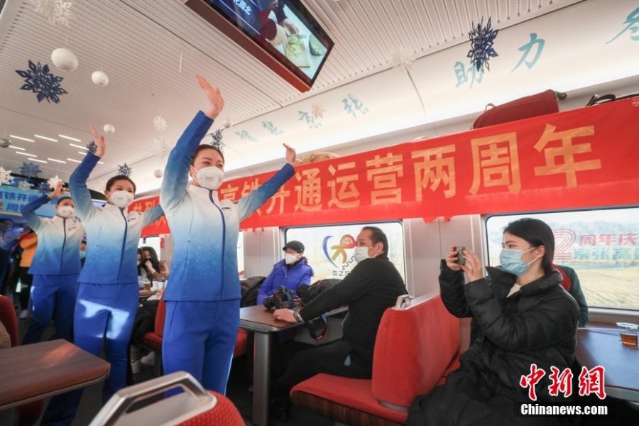 Staff wearing winter Olympic apparel dance for travelers on the G8811 high speed train bound for Taizicheng Station, Dec. 30, 2021.(China News Service/Jia Tianyong)