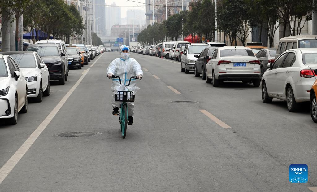 A staff member of a drug store rides a bicycle to deliver medicine in Xi'an, northwest China's Shaanxi Province, Dec. 31, 2021. Xi'an imposed closed-off management for communities and villages on Dec. 23 in an effort to curb the spread of the latest COVID-19 resurgence. (Xinhua/Tao Ming)