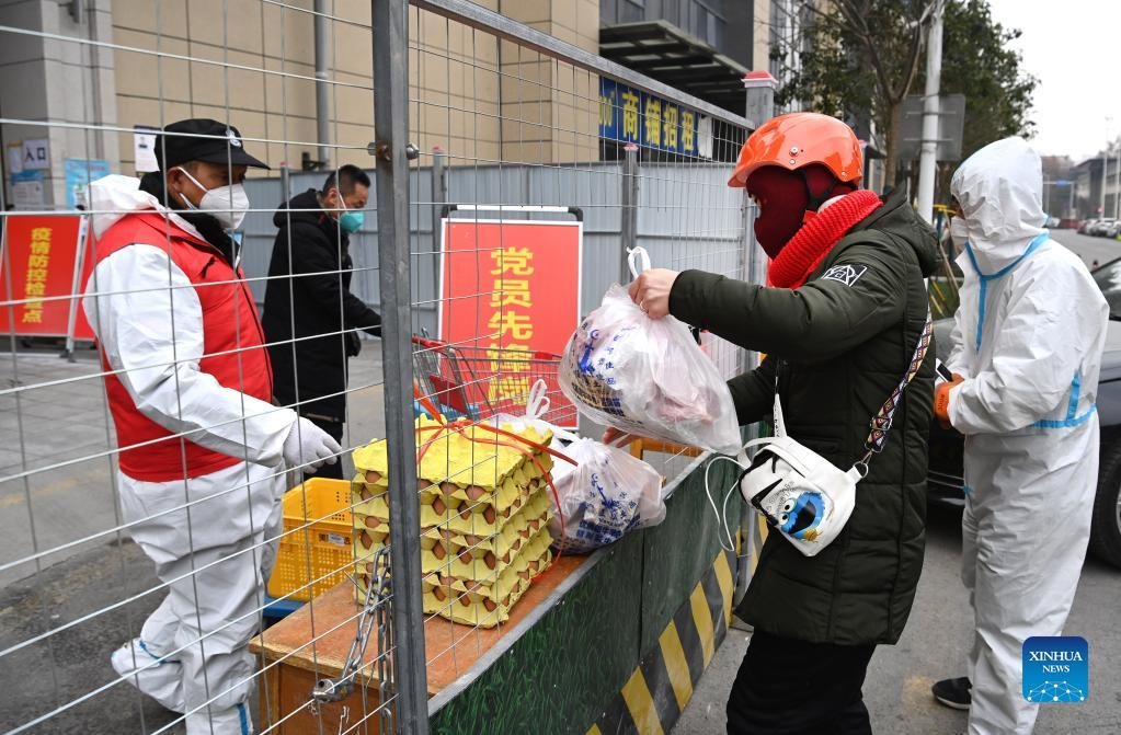 A deliveryman carries daily necessities at a residential area under closed-off management in Xi'an, northwest China's Shaanxi Province, Dec. 31, 2021. Xi'an imposed closed-off management for communities and villages on Dec. 23 in an effort to curb the spread of the latest COVID-19 resurgence. (Xinhua/Tao Ming)
