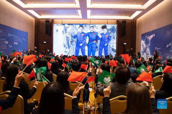 Photo taken on Jan. 1, 2022 shows college students participating in a space-Earth video talk with the Chinese astronauts on board space station Tiangong in south China's Macao. (Xinhua/Cheong Kam Ka)