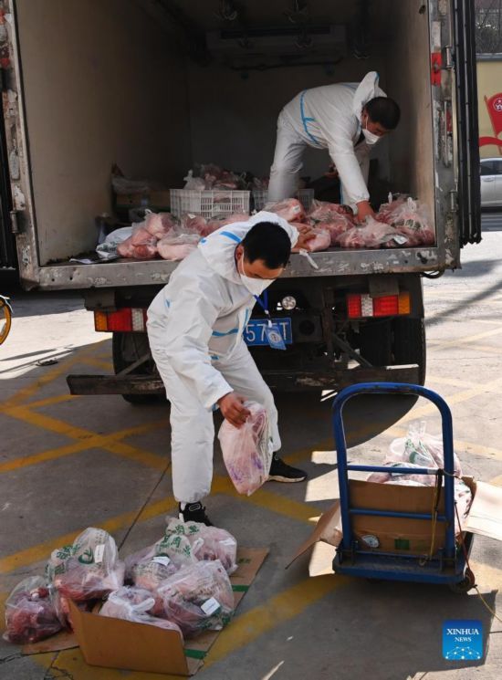 Staff of a food company deliver meat in Xi'an, northwest China's Shaanxi Province, Jan. 1, 2022. Xi'an, a northwestern Chinese city hit by a recent COVID-19 resurgence, has been making all-out efforts to ensure sufficient food and medicine supplies for its 13 million people who have been under lockdown for over a week. (Xinhua/Tao Ming)