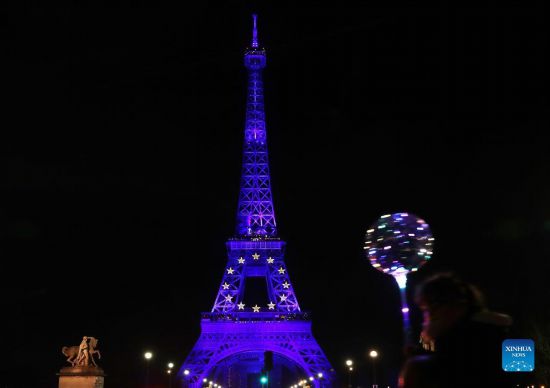 A girl holding a ballon walks past the Eiffel Tower lit up in blue to celebrate the start of the French presidency of the European Union in Paris, France, Jan. 1, 2022. Most emblematic landmarks in France turned blue Saturday night to mark French presidency of the EU. (Xinhua/Gao Jing)
