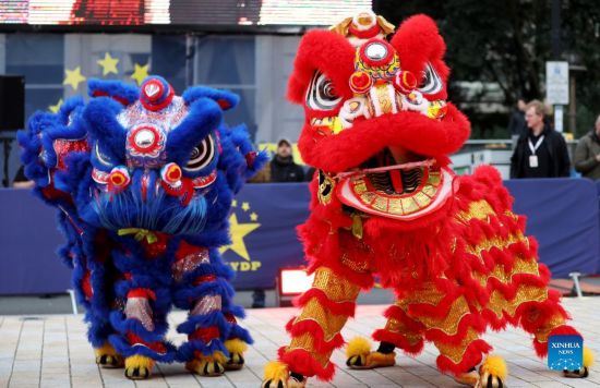 Artists perform Chinese lion dance in the annual New Year's Day Parade in London, Britain, Jan. 1, 2022. (Xinhua/Li Ying)