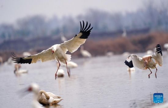 White cranes fly over a white crane conservation area by the Poyang Lake in Nanchang, east China's Jiangxi Province, Jan. 1, 2022. (Xinhua/Wan Xiang)