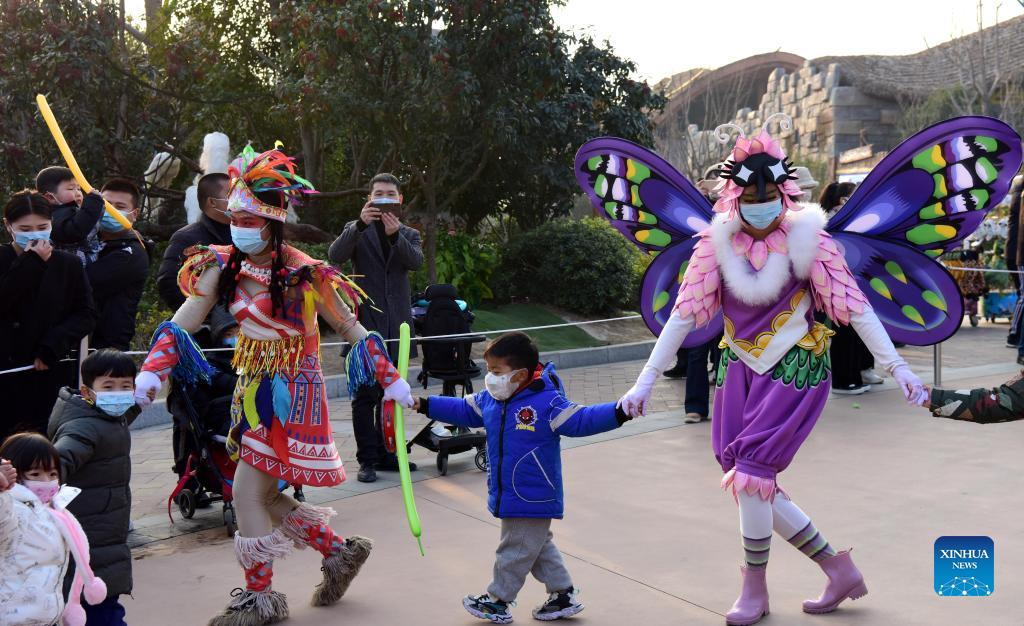 Children interact with performers at an animal-themed park in Zhengzhou, central China's Henan Province, Jan. 2, 2022. (Xinhua/Zhu Xiang)