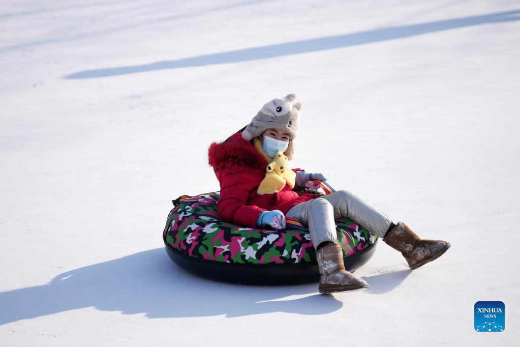 A child slides on the ice at a park in Harbin, northeast China's Heilongjiang Province, Jan. 3, 2022. (Xinhua/Wang Jianwei)