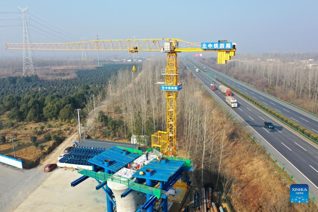 Aerial photo taken on Jan. 3, 2022 shows staff working at the construction site of a grand bridge along the Hefei-Xinyi Railway in Hefei, east China's Anhui Province. Staff of China Tiesiju Civil Engineering Group stick to their positions in construction of Hefei-Xinyi Railway even in the three-day New Year holiday. (Xinhua/Liu Junxi)