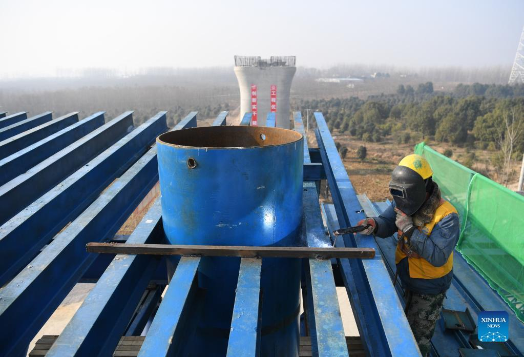 A worker is busy at the construction site of a grand bridge along the Hefei-Xinyi Railway in Hefei, east China's Anhui Province, Jan. 3, 2022. Staff of China Tiesiju Civil Engineering Group stick to their positions in construction of Hefei-Xinyi Railway even in the three-day New Year holiday. (Xinhua/Liu Junxi)