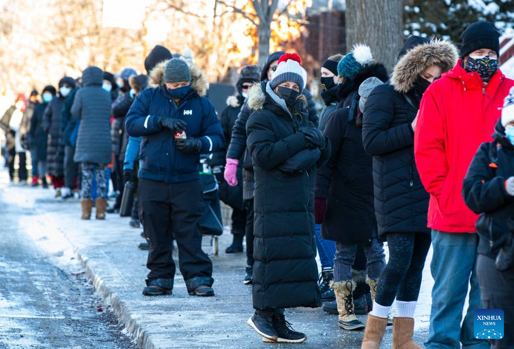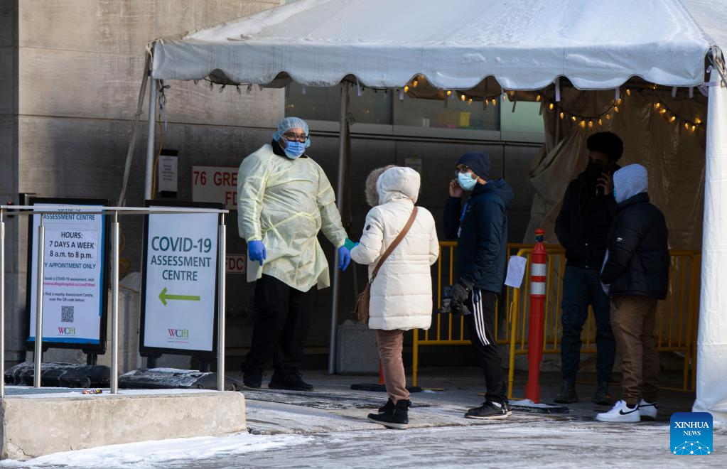 People line up to enter a COVID-19 assessment center in Toronto, Canada, Jan. 3, 2022. Canada reported 35,618 new COVID-19 cases Monday, raising its national total to 2,302,695 with 30,393 deaths, according to local media CTV. (Photo by Zou Zheng/Xinhua)