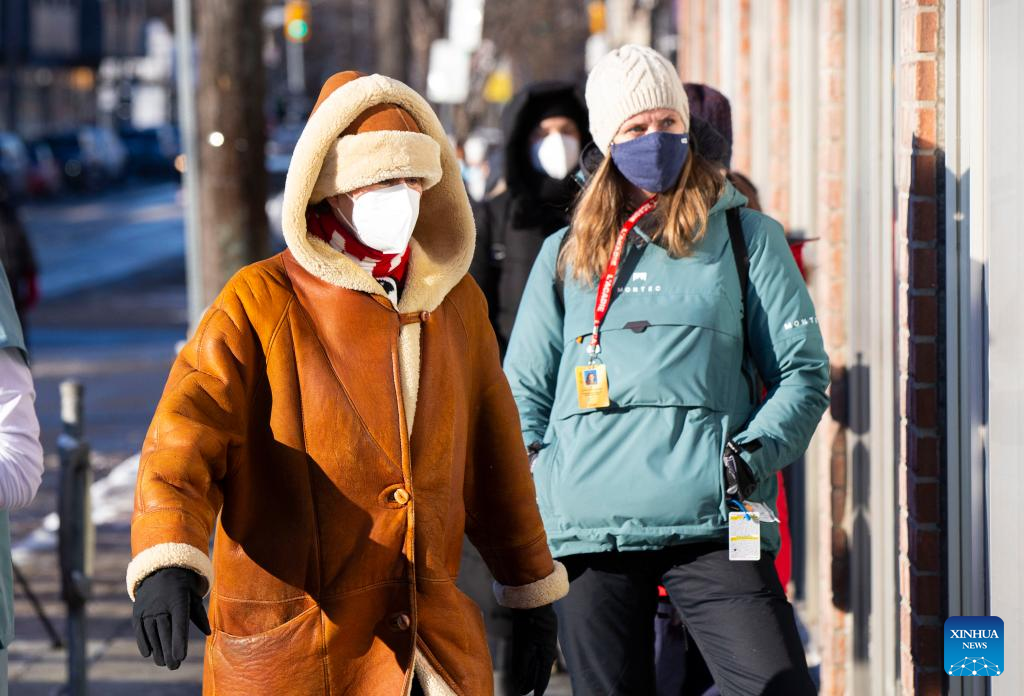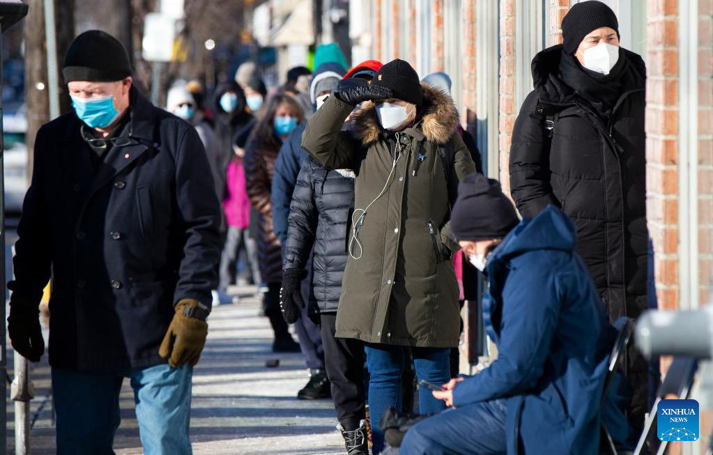 People wearing face masks line up outside a COVID-19 vaccination clinic in Toronto, Canada, Jan. 3, 2022. Canada reported 35,618 new COVID-19 cases Monday, raising its national total to 2,302,695 with 30,393 deaths, according to local media CTV. (Photo by Zou Zheng/Xinhua)