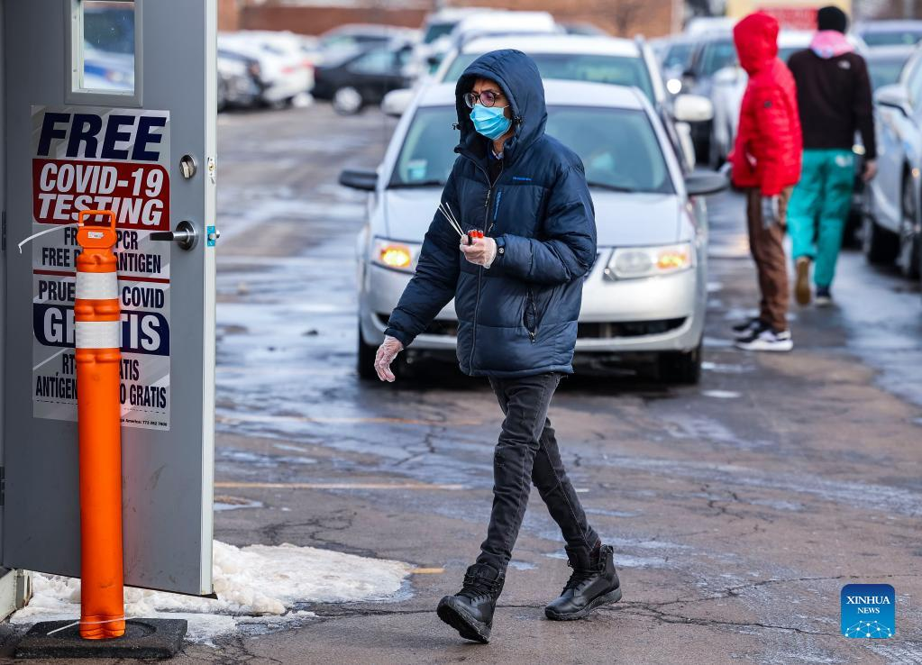 A medical worker collects COVID-19 test samples at a pop-up COVID-19 testing site in Park Ridge, Illinois, the United States, on Jan. 4, 2022. More than 103,000 people are currently hospitalized with COVID-19 in the United States, the first time the total has reached six figures in nearly four months, CNN on Tuesday quoted the latest data from the U.S. Department of Health and Human Services as saying. (Photo by Joel Lerner/Xinhua)