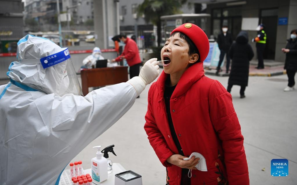 A resident receives nucleic acid test at a testing site in Xincheng District of Xi'an, northwest China's Shaanxi Province, Jan. 4, 2022. Xi'an launched a new round of all-inclusive nucleic acid testing on Tuesday to help curb the spread of COVID-19. (Xinhua/Tao Ming)