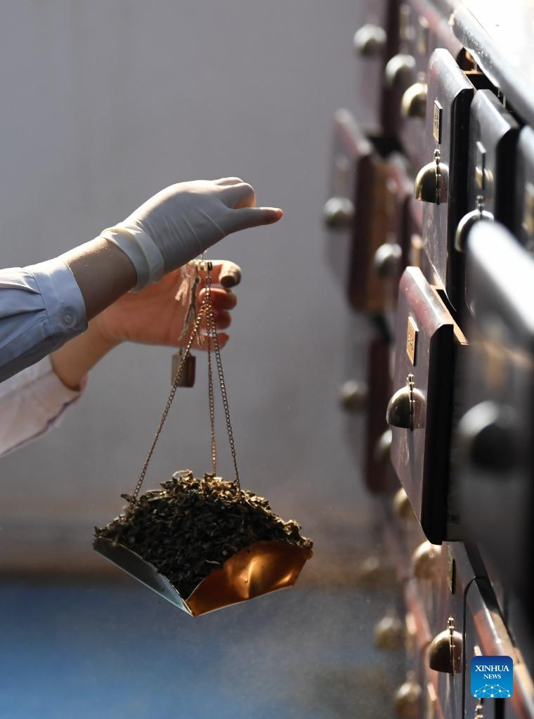 A pharmacist prepares ingredients to produce traditional Chinese medicine (TCM) decoctions at Xi'an TCM hospital in Xi'an, northwest China's Shaanxi Province, Jan. 3, 2022. The hospital has been providing TCM decoctions to individuals under medical quarantine and medical workers at the frontline to help control the recent spike in COVID-19 infections in Xi'an. (Xinhua/Li Yibo)
