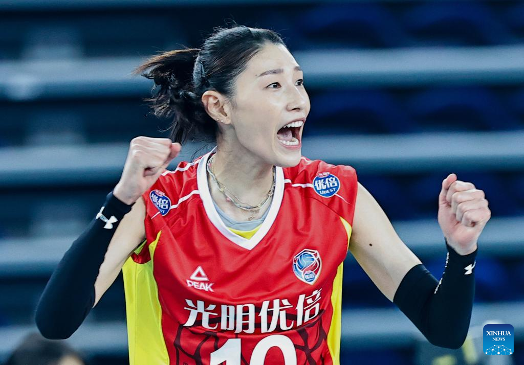Kim Yeon Koung of Shanghai celebrates scoring during the second leg of bronze medal match between Shanghai and Liaoning at the 2021-2022 season Chinese Women's Volleyball Super League in Jiangmen, south China's Guangdong Province, Jan. 4, 2022. (Xinhua/Yang Zhisen)