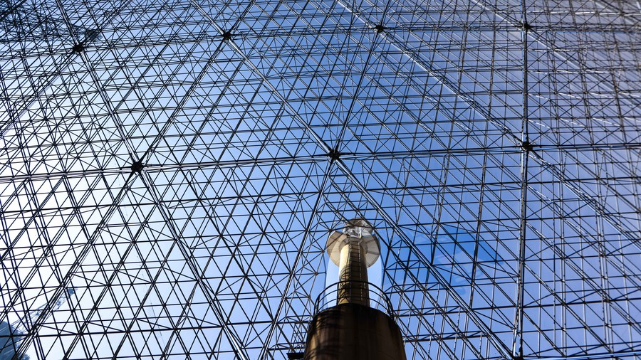A staff member conducts maintenance work at China's Five-hundred-meter Aperture Spherical Radio Telescope (FAST) in southwest China's Guizhou Province, Dec. 17, 2021. (Xinhua/Ou Dongqu)