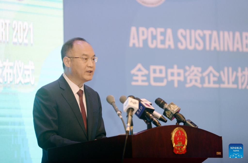Chinese Ambassador to Pakistan Nong Rong speaks at the launching ceremony of the "All-Pakistan Chinese Enterprises' Association (APCEA) Sustainable Development Report 2021" in Islamabad, Pakistan, Jan. 5, 2022. (Xinhua/Ahmad Kamal)