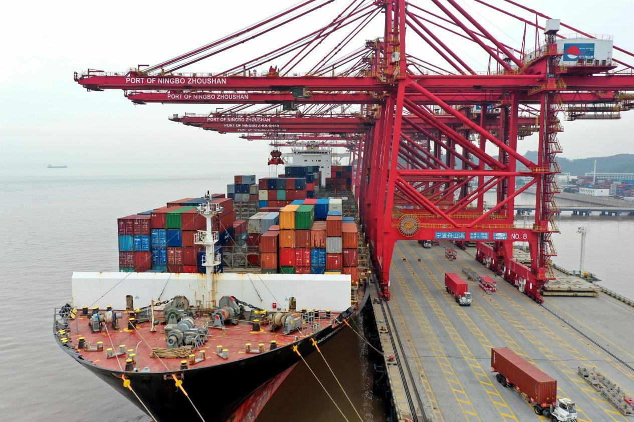 A Liberian container ship unloads 4,039 twenty-foot equivalent units of containers at the Port of Ningbo-Zhoushan, east China’s Zhejiang province, Jan. 1, 2022.
