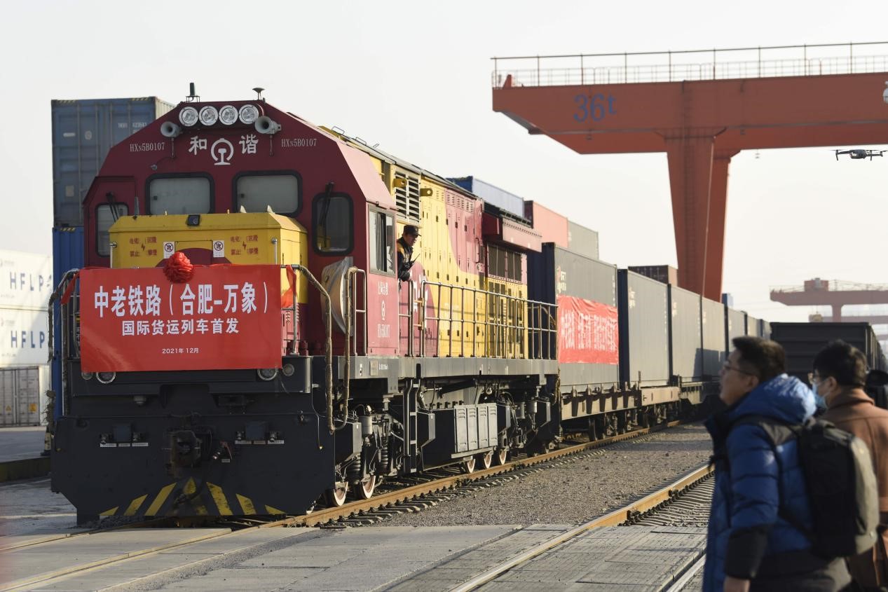 A China-Laos Railway international freight train loaded with goods produced in east China’s Anhui province leaves Hefei, Anhui, for Vientiane, Laos, on the afternoon of Dec. 30, 2021. (People’s Daily Online/Huang Yangyang)