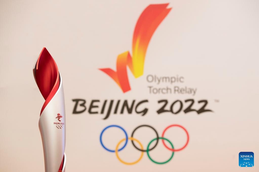 The torch is seen during the Torch Exhibition Tour of Olympic Winter Games Beijing 2022 in Harbin, northeast China's Heilongjiang Province, Jan. 5, 2022. (Xinhua/Zhang Tao)