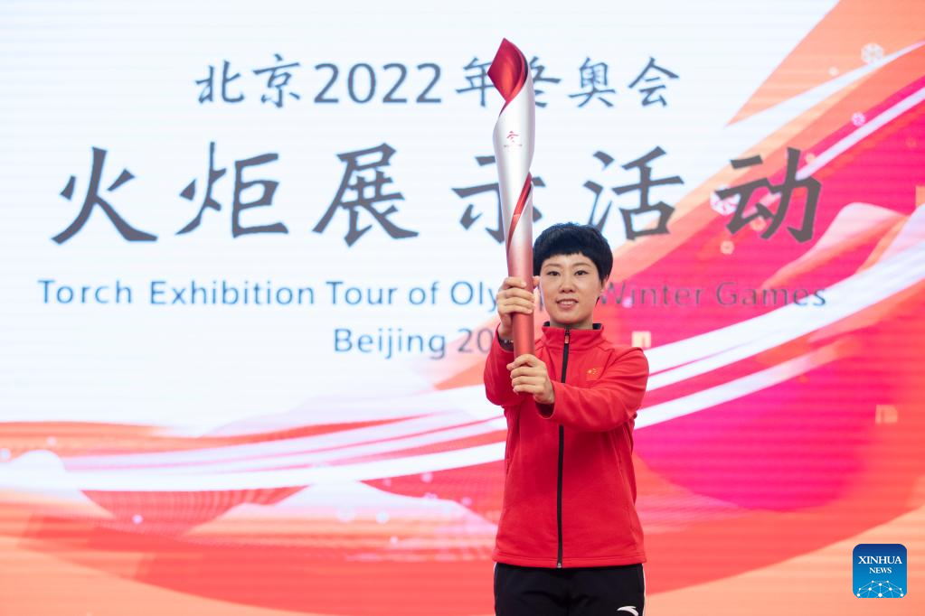Short track speed skating Olympic champion Zhang Hui holds the torch during the Torch Exhibition Tour of Olympic Winter Games Beijing 2022 in Harbin, northeast China's Heilongjiang Province, Jan. 5, 2022. (Xinhua/Zhang Tao)