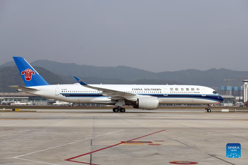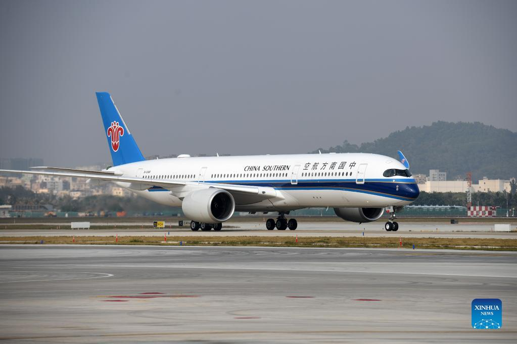 An Airbus A350-900 arrives at the Baoan International Airport in Shenzhen, south China's Guangdong Province, Jan. 6, 2022. China Southern Airlines launched two new Airbus A350-900 in Shenzhen on Thursday. The new aircraft will mainly serve domestic routes between Beijing Daxing International Airport, Shanghai and Chengdu. (Xinhua/Liang Xu)