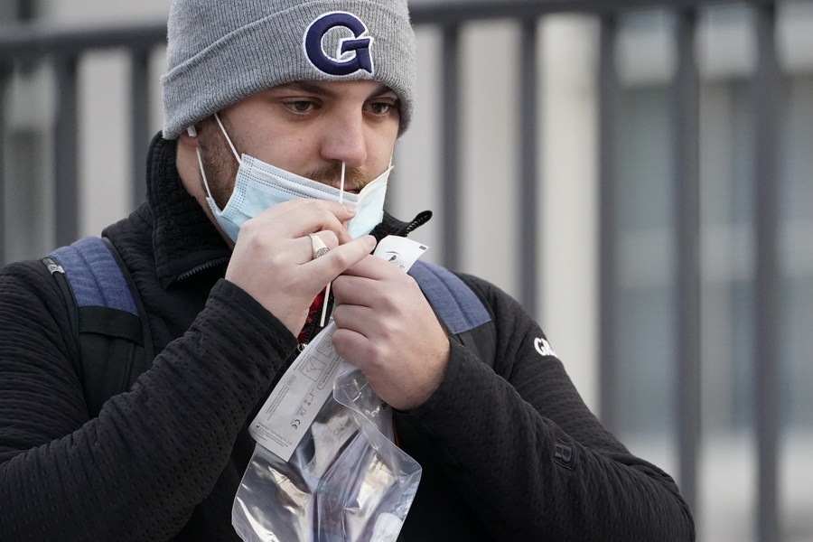 A man takes a self-administered COVID-19 test in Washington, D.C., the United States, Jan. 5, 2022. (Photo by Ting Shen/Xinhua)