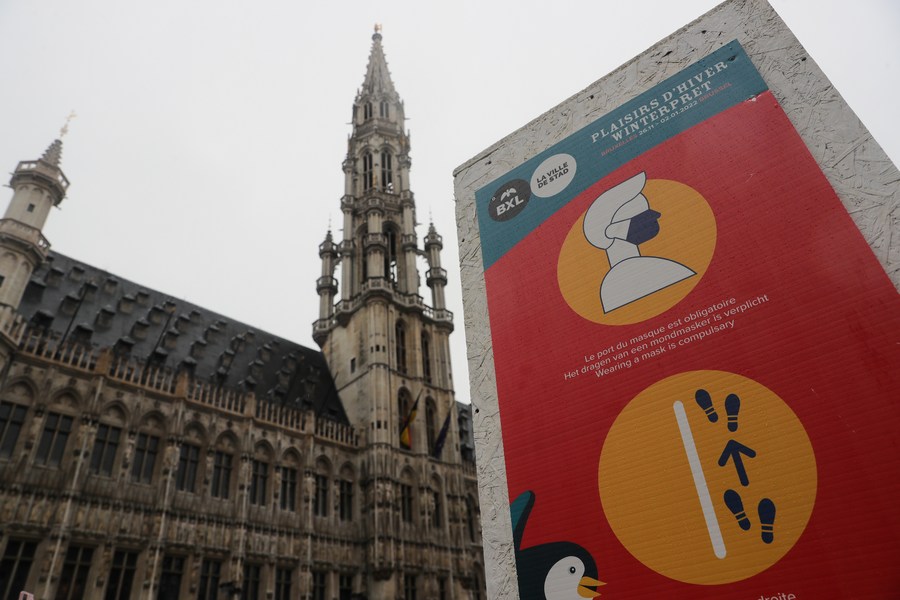 A poster showing measures against the COVID-19 is seen in the Grand Place in Brussels, Belgium, Dec. 27, 2021. (Xinhua/Zheng Huansong)