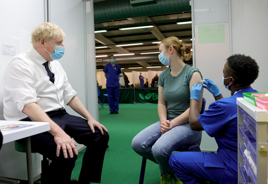 British Prime Minister Boris Johnson (L) visits a vaccination center in Aylesbury, Britain, Jan. 3, 2022. (Andrew Parsons/No 10 Downing Street/Handout via Xinhua)