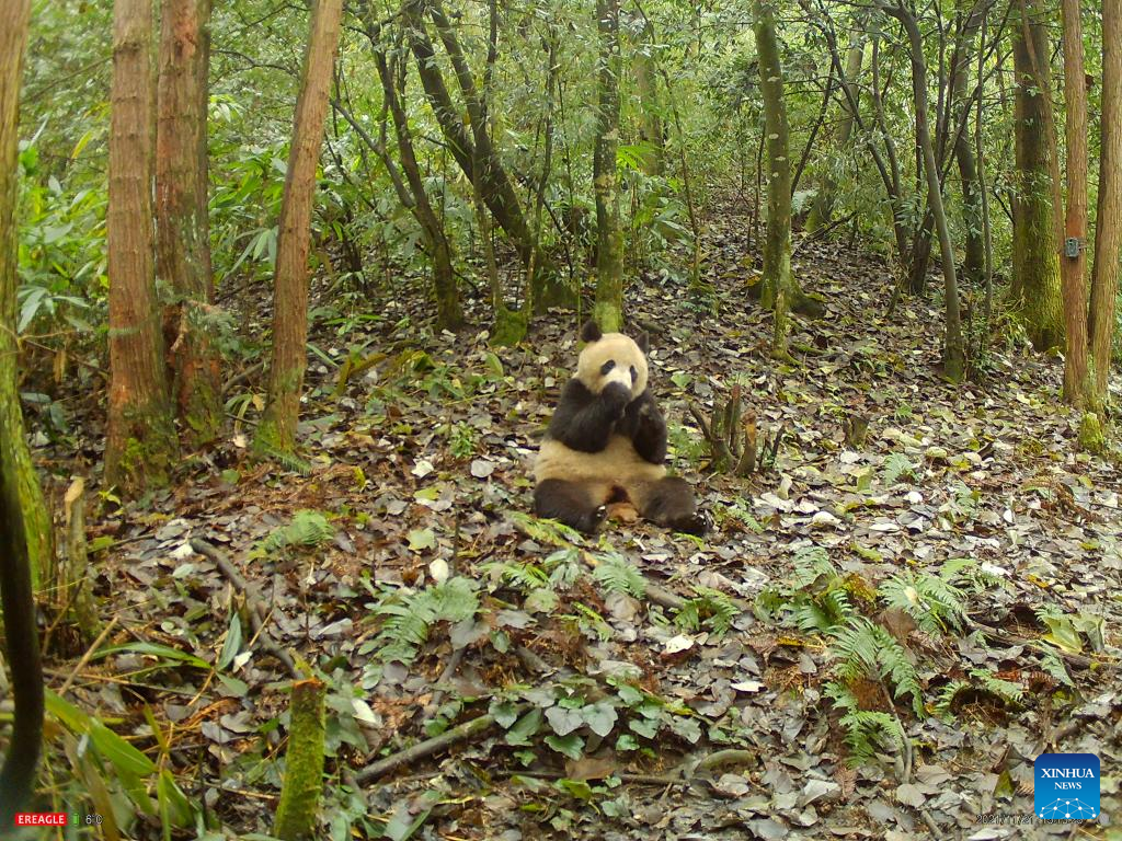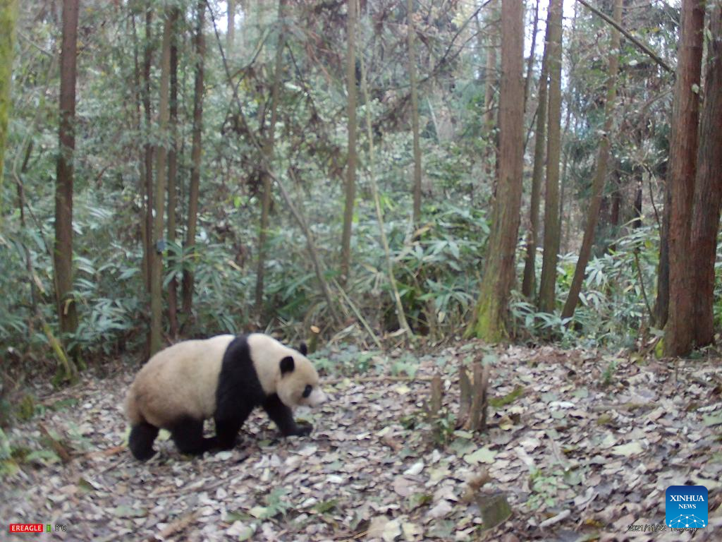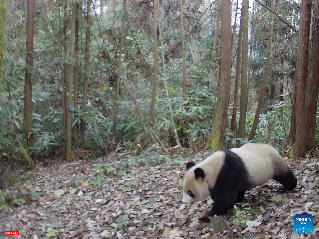 Photo taken by an infrared camera on Nov. 21, 2021 shows a giant panda named Xiaohetao in the wild. Xiaohetao was released into the Longxi-Hongkou National Nature Reserve, a habitat for wild pandas, in Dujiangyan, southwest China's Sichuan Province in December, 2018.