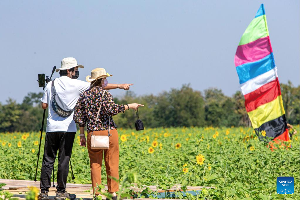 Tourists take pictures in sunflower fields in Lopburi, Thailand, Jan. 6, 2022. Lopburi province is famous for a large sunflower plantation in Thailand. From November to January, the golden sunflower fields attract many tourists. (Xinhua/Wang Teng)